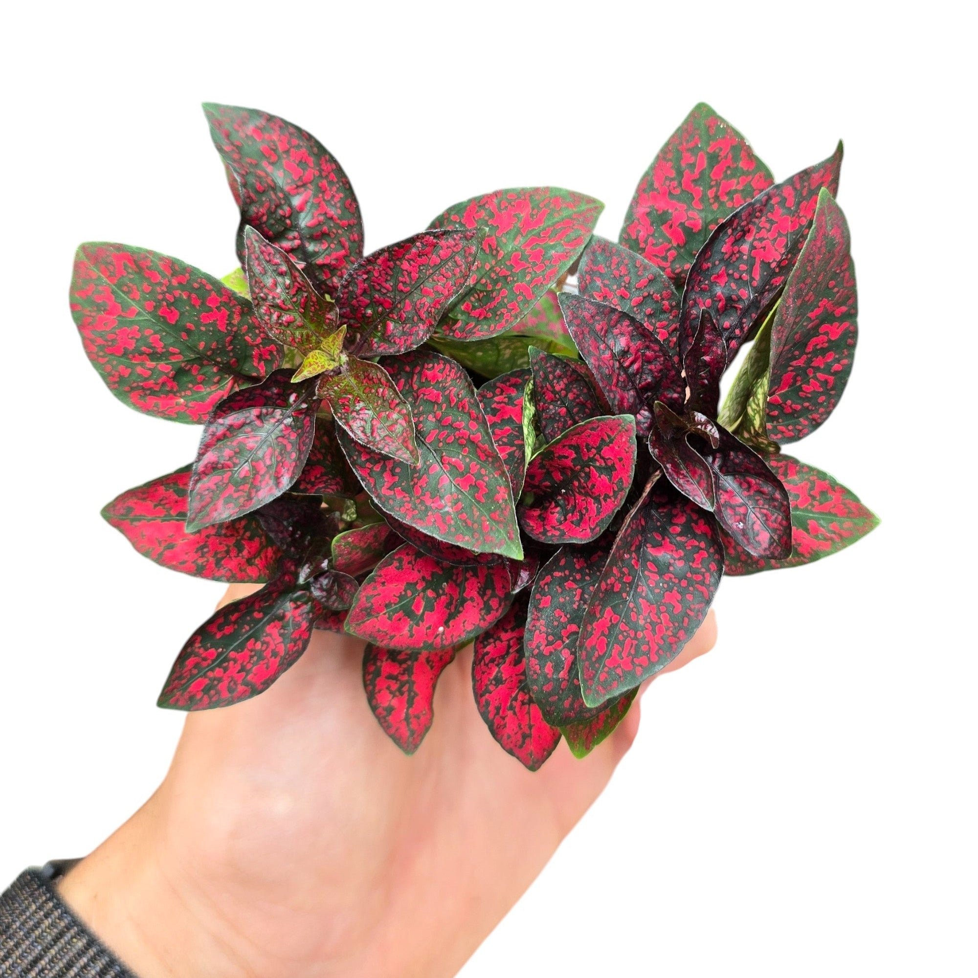 Le foglie, ovali e leggermente appuntite, sono caratterizzate da un verde brillante impreziosito da una fitta puntinatura che può variare dal rosa al rosso, fino al bianco, a seconda della varietà. Questa combinazione unica dona un effetto allegro e moderno, ideale per ravvivare qualsiasi angolo di casa.