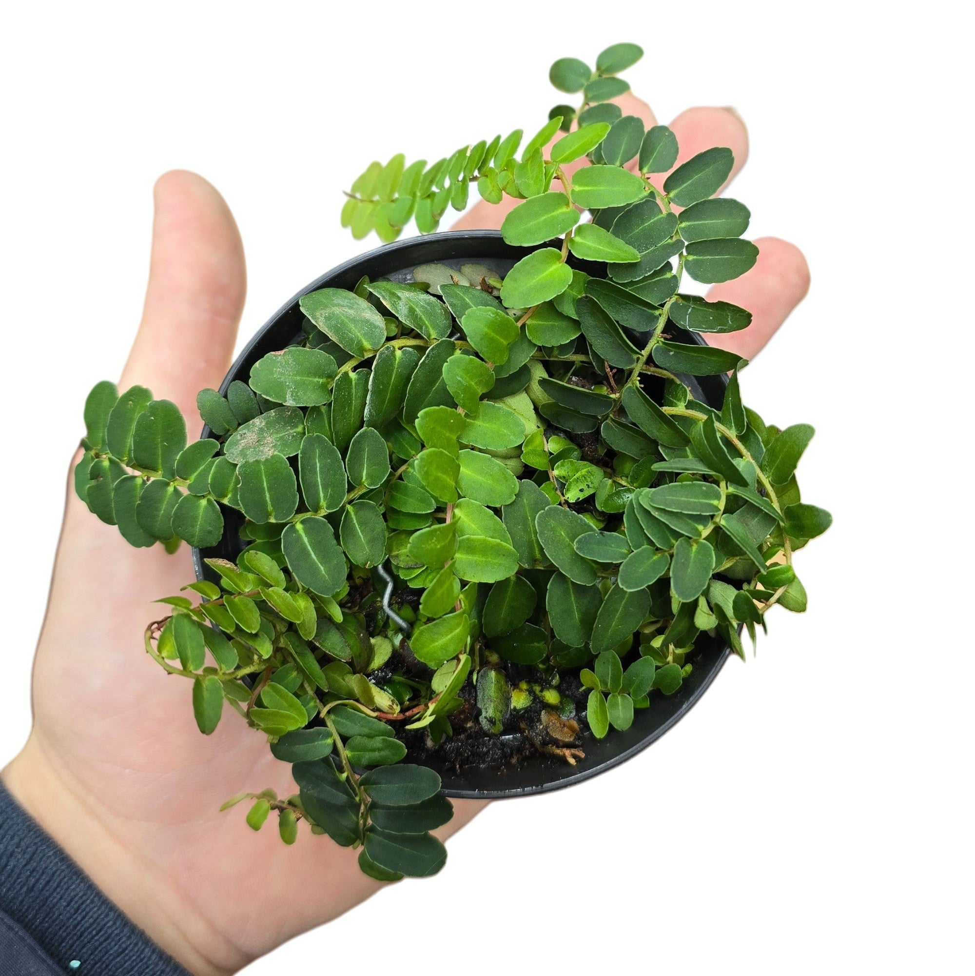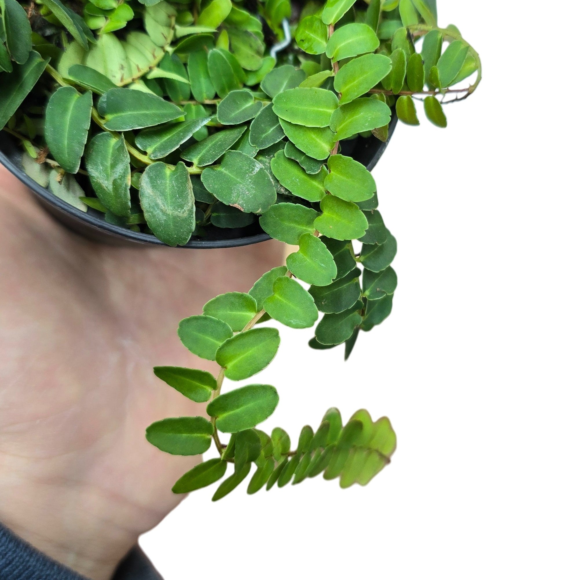 Questa specie si distingue per le sue foglie piccole, arrotondate e sovrapposte, disposte in modo estremamente ordinato lungo i fusti. Il risultato è un effetto “a squame” o a tegole, molto apprezzato nei terrari tropicali e negli allestimenti naturalistici di alto livello. Il colore è un verde medio–scuro uniforme, con una superficie liscia e leggermente satinata che riflette delicatamente la luce.